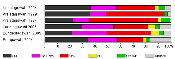 | Kreistagswahl 2004 | 46,7 | 36,6 | 20,2 | 30,5 | 2,9 | 4,3 | 5,6 | |