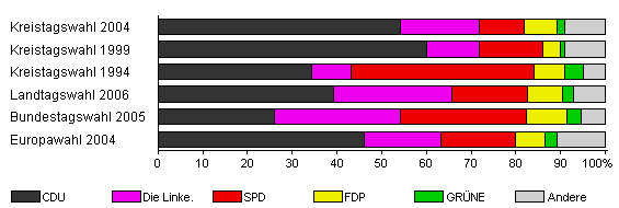 | Kreistagswahl 2004 | 52,4 | 54,2 | 17,6 | 10,0 | 7,3 | 1,7 | 9,2 | |