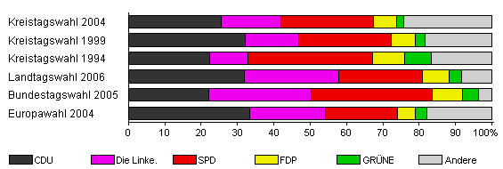 | Kreistagswahl 2004 | 45,5 | 25,6 | 16,4 | 25,4 | 6,4 | 2,0 | 24,2 | |