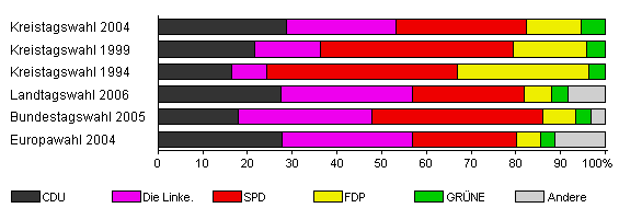 | Kreistagswahl 2004 | 33,5 | 28,6 | 24,6 | 29,2 | 12,2 | 5,4 | x | |