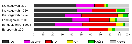 | Kreistagswahl 2004 | 58,6 | 44,5 | 19,3 | 10,3 | 1,8 | 2,1 | 22,1 | |