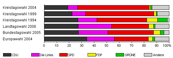 | Kreistagswahl 2004 | 63,0 | 18,9 | 7,9 | 57,3 | 0,9 | 1,2 | 13,7 | |