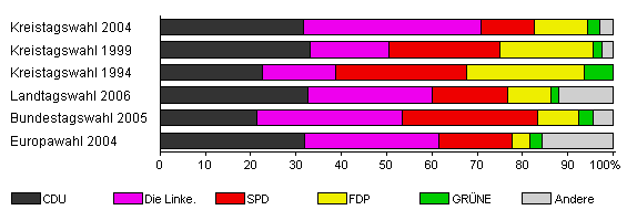 | Kreistagswahl 2004 | 46,8 | 31,7 | 39,1 | 11,7 | 11,8 | 2,8 | 2,8 | |