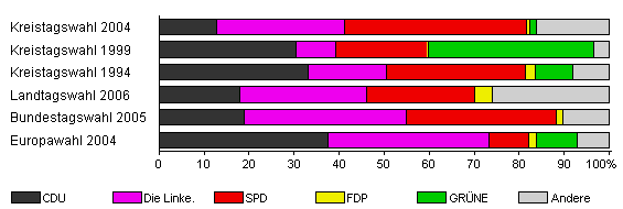 | Kreistagswahl 2004 | 75,2 | 12,9 | 28,3 | 40,4 | 0,8 | 1,3 | 16,3 | |