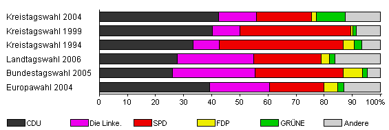 | Kreistagswahl 1994 | 78,5 | 33,4 | 9,3 | 44,0 | 3,9 | 2,7 | 6,7 | |