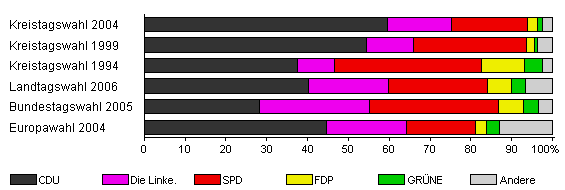| Kreistagswahl 2004 | 37,0 | 59,5 | 15,7 | 18,7 | 2,3 | 1,4 | 2,5 | |