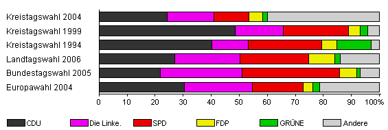 | Kreistagswahl 2004 | 50,6 | 24,2 | 16,7 | 12,6 | 4,8 | 1,8 | 39,8 | |