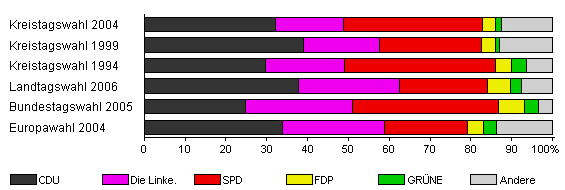 | Kreistagswahl 2004 | 37,3 | 32,2 | 16,5 | 34,1 | 3,3 | 1,3 | 12,6 | |