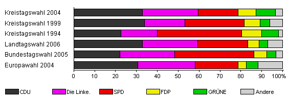 | Kreistagswahl 2004 | 33,6 | 32,9 | 26,6 | 19,1 | 8,6 | 9,4 | 3,4 | |