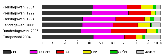 | Kreistagswahl 2004 | 54,8 | 43,1 | 28,8 | 11,6 | 10,0 | 2,9 | 3,7 | |