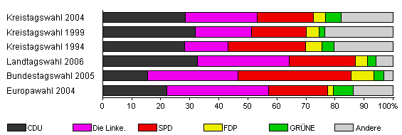 | Kreistagswahl 2004 | 43,8 | 28,5 | 24,8 | 19,3 | 4,0 | 5,6 | 17,8 | |