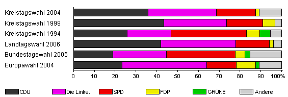 | Kreistagswahl 2004 | 69,3 | 35,9 | 32,8 | 18,8 | 1,6 | - | 10,9 | |
