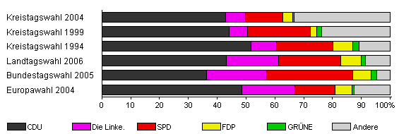 | Kreistagswahl 2004 | 47,7 | 43,0 | 6,7 | 13,1 | 3,3 | 0,5 | 33,4 | |