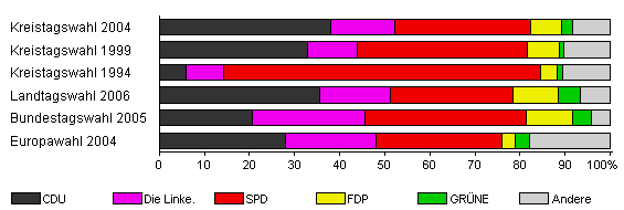 | Kreistagswahl 2004 | 59,3 | 37,9 | 14,4 | 30,0 | 7,0 | 2,4 | 8,3 | |