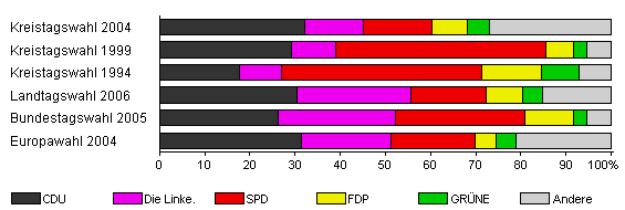 | Kreistagswahl 2004 | 51,2 | 32,2 | 12,9 | 15,3 | 7,8 | 4,9 | 27,0 | |