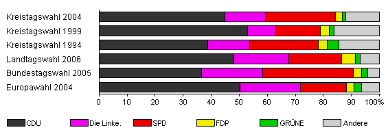 | Kreistagswahl 2004 | 50,6 | 44,9 | 14,5 | 24,9 | 2,4 | 1,2 | 12,1 | |