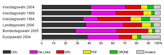 | Kreistagswahl 2004 | 49,4 | 41,2 | 29,2 | 13,2 | 5,6 | 4,9 | 5,9 | |