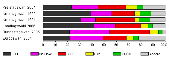 | Kreistagswahl 2004 | 59,4 | 23,4 | 21,5 | 22,8 | 9,2 | 5,0 | 18,1 | |