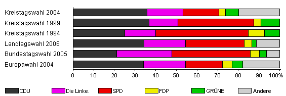 | Kreistagswahl 2004 | 56,1 | 35,9 | 17,2 | 17,4 | 3,3 | 6,4 | 19,9 | |
