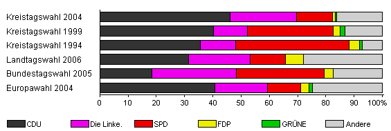 | Kreistagswahl 2004 | 55,0 | 46,2 | 23,3 | 12,9 | 1,0 | 0,5 | 16,2 | |