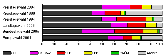 | Kreistagswahl 2004 | 61,8 | 49,6 | 23,4 | 10,1 | 7,9 | - | 9,0 | |