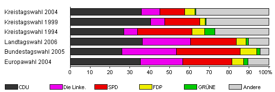 | Kreistagswahl 1999 | 75,3 | 40,4 | 7,2 | 17,7 | 2,5 | 0,6 | 31,5 | |