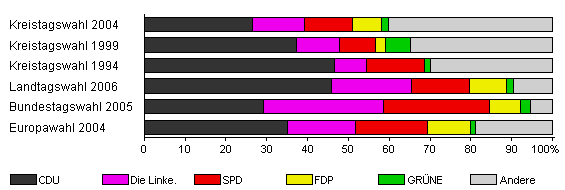 | Kreistagswahl 2004 | 60,7 | 26,6 | 12,7 | 11,6 | 7,1 | 1,7 | 40,2 | |