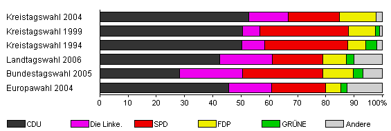 | Kreistagswahl 1994 | 76,3 | 50,2 | 8,1 | 29,5 | 6,4 | 3,8 | 2,0 | |