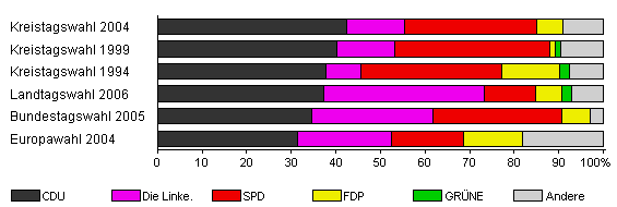 | Kreistagswahl 2004 | 58,2 | 42,5 | 13,0 | 29,5 | 5,9 | - | 9,0 | |