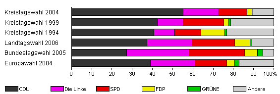 | Kreistagswahl 2004 | 56,5 | 55,1 | 17,8 | 13,9 | 2,3 | 0,5 | 10,5 | |
