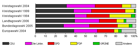 | Kreistagswahl 2004 | 49,3 | 30,9 | 28,5 | 26,7 | 9,0 | x | 4,9 | |
