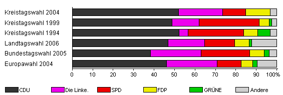 | Kreistagswahl 1999 | 71,7 | 48,8 | 13,3 | 29,2 | 4,9 | 1,3 | 2,5 | |