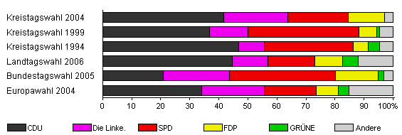 | Kreistagswahl 2004 | 72,3 | 41,7 | 22,1 | 20,8 | 12,5 | x | 2,9 | |