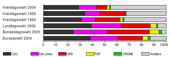 | Kreistagswahl 2004 | 42,0 | 28,6 | 14,8 | 8,2 | 2,0 | 1,0 | 45,4 | |