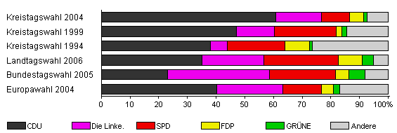 | Kreistagswahl 2004 | 62,8 | 60,9 | 15,7 | 9,8 | 4,9 | 1,4 | 7,3 | |