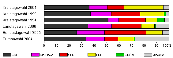| Kreistagswahl 2004 | 39,3 | 36,1 | 14,4 | 13,3 | 31,6 | x | 4,5 | |
