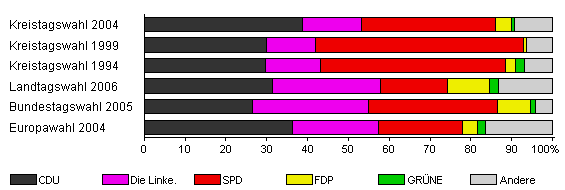 | Kreistagswahl 2004 | 55,2 | 38,7 | 14,6 | 32,8 | 3,9 | 0,7 | 9,3 | |