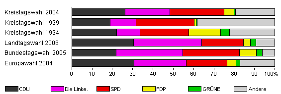 | Kreistagswahl 2004 | 39,3 | 26,2 | 22,2 | 26,5 | 5,1 | 0,6 | 19,4 | |