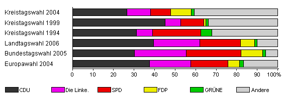 | Kreistagswahl 2004 | 57,9 | 26,4 | 11,5 | 10,0 | 10,0 | 1,3 | 40,8 | |