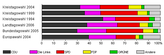 | Kreistagswahl 2004 | 45,2 | 32,2 | 16,8 | 24,1 | 10,9 | 2,3 | 13,7 | |