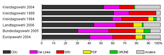 | Kreistagswahl 2004 | 63,8 | 52,3 | 13,3 | 12,1 | 0,5 | 0,3 | 21,6 | |