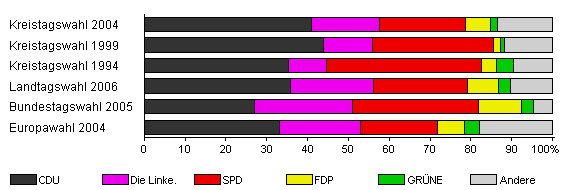 | Kreistagswahl 2004 | 48,9 | 41,0 | 16,7 | 20,9 | 6,2 | 1,8 | 13,4 | |