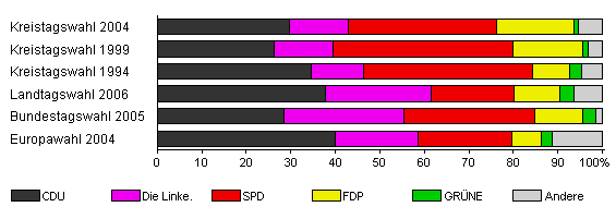 | Kreistagswahl 2004 | 48,9 | 29,8 | 13,1 | 33,4 | 17,3 | 1,1 | 5,3 | |