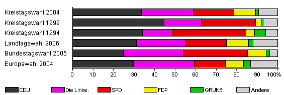 | Kreistagswahl 2004 | 42,0 | 33,5 | 25,3 | 19,9 | 10,5 | 1,5 | 9,2 | |
