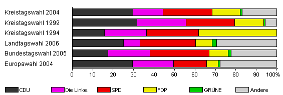 | Kreistagswahl 2004 | 72,6 | 29,8 | 14,5 | 24,0 | 13,9 | 0,9 | 17,1 | |