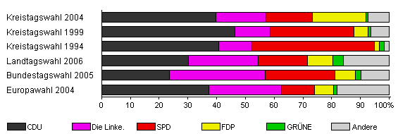 | Kreistagswahl 1994 | 76,9 | 40,7 | 11,4 | 42,7 | 1,8 | 1,6 | 1,8 | |