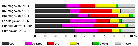 | Kreistagswahl 1999 | 58,5 | 35,1 | 8,6 | 33,6 | 7,4 | 0,8 | 14,6 | |