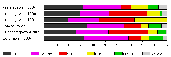 | Kreistagswahl 2004 | 35,9 | 32,0 | 30,7 | 8,0 | 13,8 | 8,4 | 7,1 | |