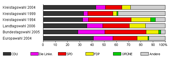 | Kreistagswahl 2004 | 53,8 | 43,1 | 7,9 | 13,5 | 7,0 | - | 28,4 | |