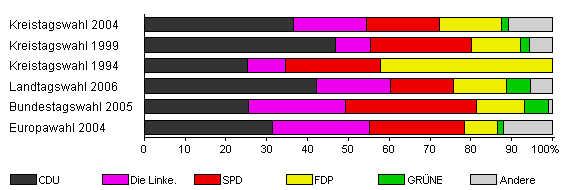 | Kreistagswahl 2004 | 51,2 | 36,5 | 17,8 | 18,0 | 15,1 | 1,9 | 10,6 | |